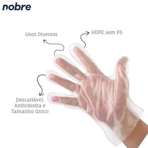 Validade: 5 anos a partir da fabricaçãoAs luvas plásticas descartáveis HDPE Nobre foram desenvolvidas para oferecer segurança em atividades rápidas que exigem higiene e cuidado. Com modelagem ambidestra e tamanho único, se ajustam facilmente às mãos, garantindo versatilidade para diferentes usos.