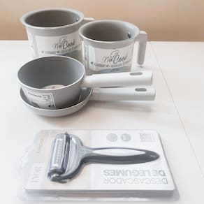 01un Frigideira mine de 300ml com 14cm diametro e 3cm altura.01un Panelinha mine de 500ml com 12cm diametro e 7cm altura.01un Fervedor com 800ml com 12cm diametro e 11 altura.01un Fervedor com 1,2litros com 14cm diametro e 11,5cm altura.01un Descascador Legumes 15cm Inox e PretoMe encantei com estas peças, apesar de ser de 2mm são muito bem acabadas e práticas para quem precisa fazer algo pouco como 01un ovo ou mesmo aquecer ou fazer uma pequena comidinha .Util para pessoas que moram sozinhas e para recem nascido.