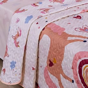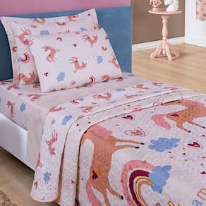 Kit 5Pçs Colcha Solteiro +Jogo De Lençol Unicórnio Rosa
