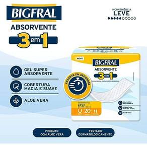 O Absorvente Bigfral 3 em 1 foi desenvolvido para incontinência leve a moderada. Absorve em segundos e possui uma cobertura macia e suave com aloe vera