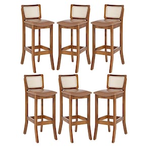 CARACTERÍSTICAS TÉCNICAS: - Produzido em Madeira Maciça Sustentável - Acabamento em Verniz na cor Imbuia - Encosto com Revestimento em Rattan com Fibra Sintética Quadriculada na cor Bege - Assento Estofado Preenchido com Espuma D23 - Assento com Revestimento em Tecido Impermeável na cor Caramelo L85 - Banqueta Entregue Montada *Kit Composto por SEIS Banquetas