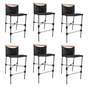 Kit 6 Banquetas Em Corda Náutica Base Em Alumínio Cinza Com Detalhe Em Madeira Preta Preto