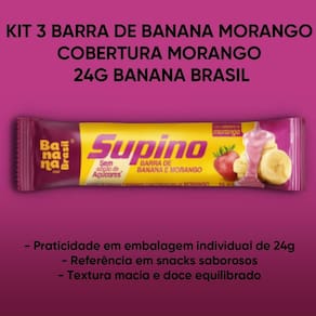 Destaques do Produto - Combinação de banana e morango em formato de barra - Cobertura de morango cremosa e saborosa - Praticidade em embalagem individual de 24g - Textura macia e doce equilibrado - Produzida pela Banana Brasil, referência em snacks saborosos e Criativos
