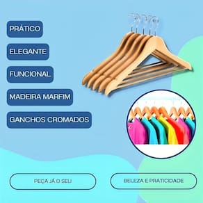 - Materiais de alta qualidade - Em Madeira Marfim Envernizada - Gancho Cromado - Design clássico - Robustos e Duráveis - Para Roupas Pesadas - Ideal para Vestidos, calças, camisetas e terno, etc. - Com cava adequada para roupas com alças.
