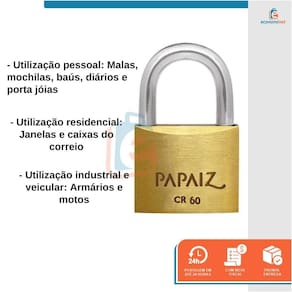 Os cadeados Papaiz são sinônimos de proteção e referência mundial de qualidade. Produzidos com matérias-primas de primeiríssima qualidade garante grande resistência e durabilidade, mesmo em ambientes úmidos. Seu corpo feito em latão maciço, possui haste reforçada (cementada e temperada) e acabamento cromado que aumenta a resistência ao corte.