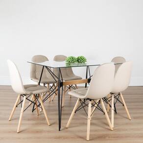 O design clássico da Eiffel com o conforto da base estofada, perfeito para ambientar sua sala de jantar, cozinha ou área de lazer com funcionalidade e estilo. Conjunto com 6 cadeiras com estrutura de madeira compensada, assento revestido com espuma e tecido PU. Base torre de madeira faia e aço, o que deixa a cadeira resistente. Peça versátil com várias opções de cores, essa cadeira fica linda em qualquer ambiente. Importante: recomendável para uso residencial. Este produto requer que seja feita uma manutenção regular simples, como apertar os parafusos periodicamente. Acabamento da Estrutura: Verniz Almofada do assento: Fixa Altura do assento até o chão: 45 Ambiente Principal: Sala de Jantar Apoio para Braços Estofado: Complexidade da Montagem: Baixa: pode ser montado por uma pessoa sozinha Cor: Nude Cor do Produto: Nude Dobrável: Não Enchimento do Assento: Espuma D-20 Enchimento do Encosto: Espuma D-20 Escala de Brilho: Fosco Estrutura do Assento: Aço pintado e Madeira Faia Estrutura do Encosto: Madeira Giratória: Não Informações Complementares: Conjunto com 6 cadeiras com assento estofado em PU e base em madeira e aço pintado. Itens Inclusos: 6 Cadeiras, Kit Ferragens e Manual de Montagem Linha ou Coleção: Cadeiras Manual de Especificação Técnica: Manual de Montagem e Instalação: https://cdn2.madeiramadeira.com.br/atributo/rivatti-moveis/367979-manual-cadeira-eiffel-boton-hb13.pdf Material da Base: Madeira Necessita Montagem: Sim Origem do Produto: Importado Peso: 4.1 Possui Apoio para Braços: Não Possui Apoio Para os Pés: Não Possui Rodízio: Não Recomendações de Uso, Manutenção e Limpeza: Limpar com pano umedecido em água e sabão neutro e secar em seguida com flanela macia. Uso interno. Não expor ao sol ou umidade, para assim manter as características únicos do produto. Não exceder a capacidade de peso. Revestimento do Assento: Poliuretano Revestimento do Encosto: Poliuretano Rodízio com Trava: Sistema de Montagem: Parafusos e encaixe Tipo de Assento: Fixo Tipo de Encosto: Fixo Tipo de Madeira Maciça: Faia