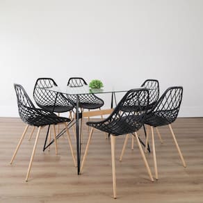 A Cadeira Cloe é especial para quem busca praticidade com toques de design. Seu assento com detalhes vazados em polipropileno confere um ar moderno para a decoração e a base em aço tem adesivo que imita madeira, aplicado por transferência de calor. Importante: recomendável para uso residencial. Este produto requer que seja feita uma manutenção regular simples, como apertar os parafusos periodicamente. Conjunto com 6 Cadeiras com assento e encosto em polipropileno, sem braços, possui base fixa em aço com aplicação de adesivo na cor madeira. Acabamento da Estrutura: Adesivo Almofada do assento: Altura do assento até o chão: 43 Ambiente Principal: Cozinha Apoio para Braços Estofado: Complexidade da Montagem: Baixa: pode ser montado por uma pessoa sozinha Cor: Preto Cor do Produto: Preto Dobrável: Não Enchimento do Assento: Enchimento do Encosto: Escala de Brilho: Fosco Estrutura do Assento: Aço e polipropileno Estrutura do Encosto: Polipropileno Giratória: Não Informações Complementares: Conjunto com 6 Cadeiras com assento e encosto em polipropileno, sem braços. Possui base fixa em aço com aplicação de adesivo na cor madeira. Itens Inclusos: 6 Cadeiras, Kit Ferragens e Manual de Montagem Linha ou Coleção: Cadeiras Manual de Especificação Técnica: Manual de Montagem e Instalação: https://cdn2.madeiramadeira.com.br/atributo/rivatti/578960-manual-cloe-base-a-o-hb18.pdf Material da Base: Aço Necessita Montagem: Sim Origem do Produto: Importado Peso: 3.5 Possui Apoio para Braços: Não Possui Apoio Para os Pés: Não Possui Rodízio: Não Recomendações de Uso, Manutenção e Limpeza: Uso interno. Não expor ao sol ou umidade. Não exceder a capacidade de peso. Limpar com pano macio umedecido em solução de água e sabão neutro e secar em seguida. Não utilizar produtos químicos ou abrasivos. Revestimento do Assento: Polipropileno Revestimento do Encosto: Polipropileno Rodízio com Trava: Sistema de Montagem: Parafusos Tipo de Assento: Fixo Tipo de Encosto: Fixo Tipo de Madeira Maciça: