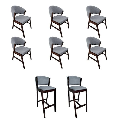 AS IMAGENS SÃO MERAMENTE ILUSTRATIVAS E PODEM SOFRER VARIAÇÕES DE COR E PEQUENOS DETALHES DE ACORDO COM O SEU MONITOR, ILUMINAÇÃO DO AMBIENTE E ATÉ MESMO A SUA PERCEPÇÃO 6 Cadeiras de Jantar Debora com 2 Banquetas Ana Madeira MaciÃa Castanho Premium Linho Cinza