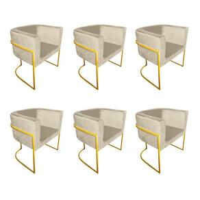 AS IMAGENS SÃO MERAMENTE ILUSTRATIVAS E PODEM SOFRER VARIAÇÕES DE COR E PEQUENOS DETALHES DE ACORDO COM O SEU MONITOR, ILUMINAÇÃO DO AMBIENTE E ATÉ MESMO A SUA PERCEPÇÃO VISUAL.Kit 6 Cadeiras De Jantar Premium Base De Ferro Dourada Veludo Bege