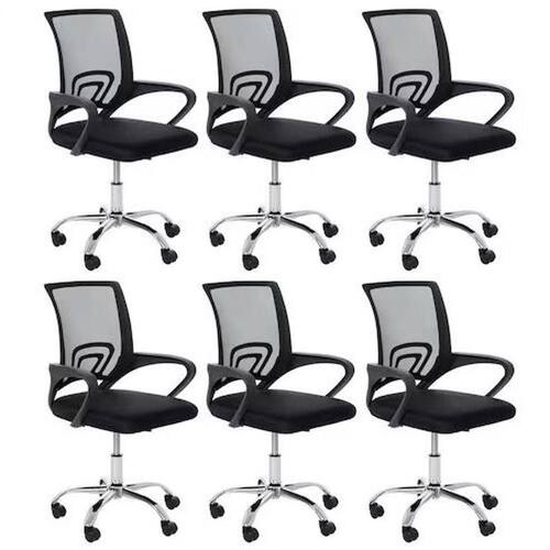 Kit 6 Cadeiras De Rodízios Escritório Home Office Telinha Preto A cadeira de escritório conta com base cromada moderna e muito confortável!Modelo com regulador de altura, assento estofados revestido em tecido mesh 100% poliéster e encosto revestido em tecido mesh , rodízios em nylon proporcionando mais conforto durante as horas de uso, Com um design único, somado a toda sofisticação e elegância necessária para combinar com seu escritório! É a escolha perfeita para quem busca qualidade e conforto com um preço baixo. Especificações Técnicas:Modelo: Mesh New JavaBase: CromadaCor: PretaRegulável: simAmbiente: EscritórioEncosto Fixo: SimEncosto Material: Tela meshAssento estofado com espuma (D26) Revestimento: PolipropilenoPeso suportado pelo produto: até 120kgMaterial do Assento: Madeira Compensada Revestida em Tela Mesh, Tecido telado - AcolchoadoAcabamento: Espuma Injetada de Alta DensidadePistão a gás classe 3 Dimensões da Cadeira:Altura mínima 80 cmAltura máxima: 87 cmLargura: 57 cmComprimento: 48 cmAssento Largura: 48 cmAltura do assento ao chão: 36-46 cmEspessura: 6 cmPeso: 8 kgGarantia legal de 90 dias para defeito de fabricação. Instruções/Cuidados: Produto recomendado para uso doméstico. Limpar com pano macio seco ou levemente humedecido com água.