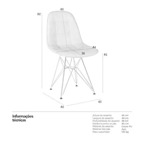Material do assento: PU SintéticoMaterial da base: Aço cromadoAltura do assento: 45 cmLargura do assento: 44 cmProfundidade do assento: 38 cmPeso suportado: 130 kgNecessita montagem: SimLimpeza e cuidados: Pano úmido sem aplicação de produtos químicos ou abrasivos NA