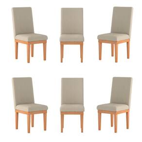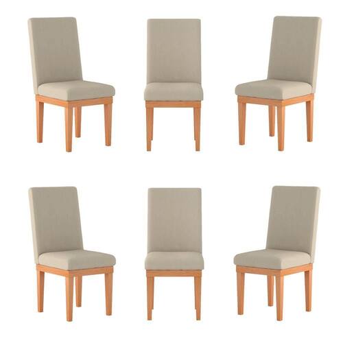 Kit 6 cadeiras estofadas reforçadas para mesa de jantar Cor: bege A cadeira reforçada estofada traz muita segurança e conforto para seu ambiente de jantar. Sua estrutura é 100% em madeira eucalipto e todo conforto se deve a espuma com densidade d-23. Com um design sofisticado, a cadeira conta com acabamento em suede. Qual o material utilizado - tecidos suede; - espuma d-23; - percintas elásticas; - estrutura 100% madeira eucalipto; - pés madeira de eucalipto. Produto suporta até 120 kg. de fábrica de 03 meses contra defeito de fabricação. Instruções de montagem: Produto montado, sendo necessário apenas rosquear os pés. Observações importantes: -todos os produtos vão embalados com total segurança. - pode haver alguma diferença de tonalidade entre a imagem e o produto, por conta do tratamento de imagens e a calibração de cores da sua tela. Modo de limpeza: - limpar com pano limpo e moderadamente úmido Especificações técnicas Travamento da estrutura com grampos em aço galvanizados e parafusos com flange de 5 mm; Madeira de reflorestamento eucalipto; Tecido suede 100% poliéster. Dimensões Altura: 94 cm Largura: 43 cm Profundidade: 55 cm Peso: 5 kg