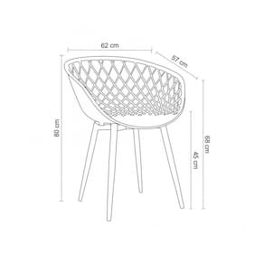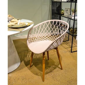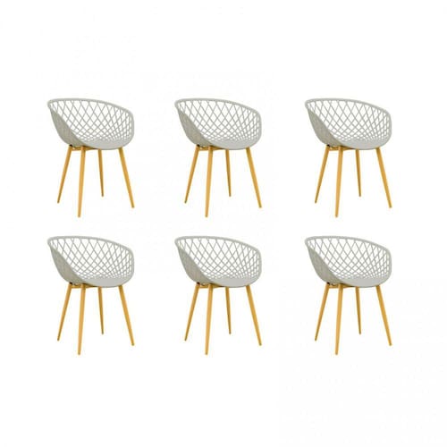 Uma cadeira versátil, perfeita para vários ambientes: desde a mesa de jantar, ao aconchego do quarto. Conjunto com 6 Cadeiras com assento em PP, com braços e encosto. Possui base fixa em metal adesivado com textura em madeira.