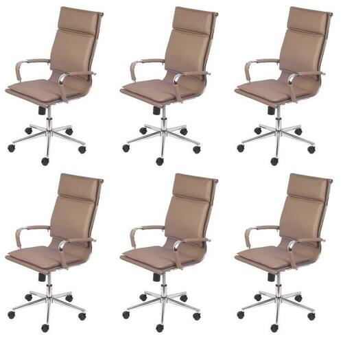 A cadeira OR-3304 alta possui assento de PU e com revestimento em couro ecológico, estrutura metalizada e rodas de PU que não danificam o piso. Conta com sistema relax com travamento e detalhes nos braços. Cadeira extremamente confortável, suporta 120kg. Altura do Conjunto: 116 cm Ambiente: null Ambiente Principal: Escritório Cor: Caramelo Cor do Produto: Caramelo Informação Complementar: 6x Cadeira Para Escritorio Presidente Design Italiano Estofada Em Sintético 3304 Caramelo Largura: 57 cm Altura: 116 cm Peso: 12,8 kg Profundidade: 58 cm Necessita Montagem: Sim