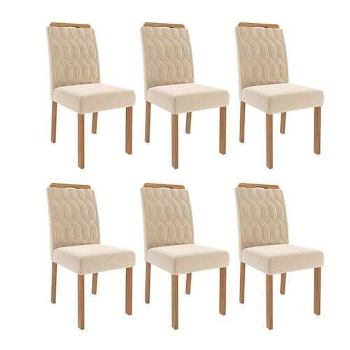 O Conjunto 6 Cadeiras Paola une design sofisticado e conforto excepcional. Estruturada em madeira de eucalipto, reconhecida pela sua resistência e durabilidade, a peça traz assento e encosto estofados com espuma de alta densidade, proporcionando máximo conforto. O revestimento em tecido sued confere um toque macio e refinado, enquanto o encosto com detalhes bordados valoriza o visual com um acabamento elegante. Ideal para salas de jantar que buscam estilo e aconchego, a Cadeira Paola é sinônimo de qualidade e bom gosto. Acabamento: Verniz Altura do Conjunto: 99 cm Ambiente: null Ambiente Principal: Sala de Jantar Cor: Nude Informação Complementar: 3x Jogo com 02 Cadeiras Paola Wood Ii Madeira/Nude Largura: 46 cm Altura: 99 cm Peso: 18 kg Profundidade: 57 cm Necessita Montagem: Sim