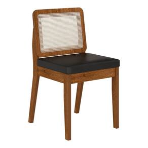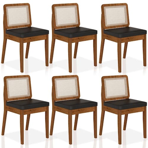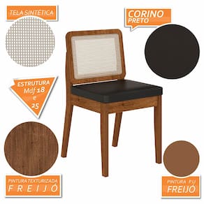 Detalhes Técnicos das Cadeiras - Assento Tapeçado, Estofado e Fixo - Encosto com Tela Sextavada - Palha Sintética - Tecido Corino - Estrutura: MDF - Tonalidade: Freijó/Corino Preto - Medida: A: 84CM x L: 53CM x P: 45CM - Do chão até o assento possui 47cm - Suporta até 90kg (cada)
