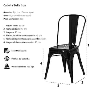 Modelo: Cadeira Tolix Iron Design Preta Assento: Aço com Pintura Epoxi Base: Aço com Pintura Epoxi Profundidade: 47 cm Largura: 45 cm Altura Total: 86 cm Altura do Chão Até o Assento: 45 cm Profundidade Interna do Assento: 36 cm Largura Interna do Assento: 45 cm Peso Máx. Recomendado: 120 kgs Peso unitário: 6 kgs