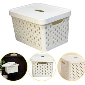 Kit 6 Caixa Cesto Organizador Multiuso Empilhável 17L Branco Kit 6 Caixa Cesto Organizador Multiuso Empilhável 17L Branco DESIGN FUNCIONAL Contorno rebaixado para encaixar o fundo da caixa: Você não precisa deixar a tampa separada ou distante do Cesto, pois o rebaixamento permite que tudo se encaixe perfeitamente, garantindo um acabamento mais ajustado e prático