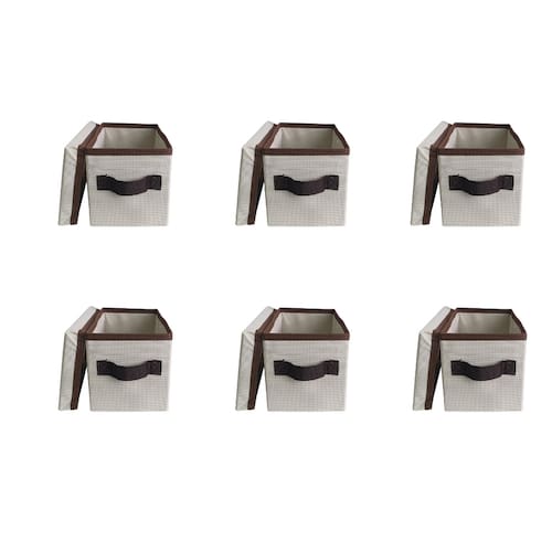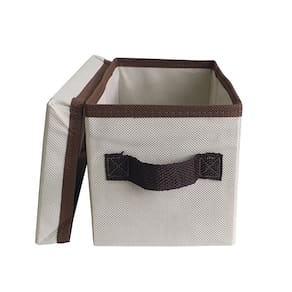 Largura: 14 cm Altura: 15 cm Profundidade: 28 cm Cor predominante: bege. Cor da borda: Marrom Puxador: alça ou ilhós Com tampa Material: TNT 80g, estrutura de Cadboard, e poliéster Peso: 237g