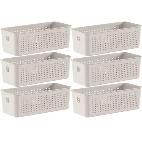Garantia: 90 dias / Peso: 0,936kg / Cor predominante: bege / Ref: 7798140165323; Conteúdo: 6 cestos organizadores multiuso com perfurações Ou; Dimensões de cada cesto: 26cm (C) x 12,5cm (L) x 13cm (A); Material: polipropileno; Capacidade: 4,2l; Modelo: Flow.