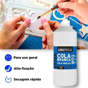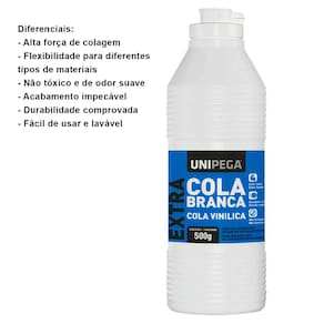 Ficha Técnica:Marca: Unipega Modelo: Cola Branca Extra Vinílica Peso: 0,5Kg cada unidade Produto à base de água Não tóxico Odor suave Resistente à umidade Ideal para artesanato e marcenaria