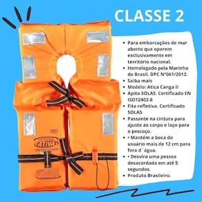 Informações adicionais Classe ii P 55 a 110 kg Cor: laranja Diâmetro interno: 20cm Para navegação em mar abero Legislação e normas desenvolvido e fabricado de acordo com a normam 05/dpc Utilizado em embarcações de mar aberto Desvira uma pessoa desacordada em até 5 segundos. Fabricado com tecido poliéster grosso,e espuma de polietileno de celula fechada. Apitoapito solas. Certificado en iso12402-8 Tirantespassante na cintura para ajuste ao corpo e laço para o pescoço. Dobra larga nos ombros para maior conforto e ergonomia. Informações de classe e cuidados de uso estampados no colete. Sistema de desviramento: diferença no número de placas flutuantes no peito do colete para que desvire de forma eficiente uma pessoa desacordada em até 5 segundos