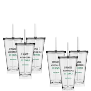 Kit eco com copos com tampa e canudo eco personalizados para ajudar o meio ambiente. Adote o seu copo e evite descartáveis. Juntos somos mais fortes. Confira as opções de copos, taças e canecas ecológicas personalizadas. Especificações: Material: Acrílico PS Altura: 14,5 cm Diâmetro: 9,5 cm Capacidade: 550 ml Cor: Transparente Quantidade: 6 peças Ean: 7897581915440