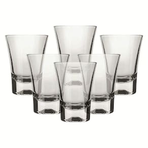 Material: vidro; Medidas cada copo: (comp. X larg. X alt.) 5,3 x 5,3 x 7,1 cm; Capacidade cada copo: 60 ml; Peso cada copo: 90g; Resistente e com design único; Vai a lava louças;