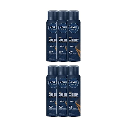 DESODORANTE NIVEA MEN DEEP AMADEIRADO AEROSOL ANTITRANSPIRANTE 48H Com Carvão Ativado. Desodorante Nivea Men Deep Amadeirado possui fórmula eficaz, com Carvão Ativado que atua poderosamente contra bactérias e proporciona uma fragrância amadeirada com notas de chocolate e lavanda. Nivea Men Deep Antitranspirante com proteção de 48 horas, proporcionando uma sensação duradoura de pele limpa e seca, exatamente como após o banho. O poder do carvão ativado em uma fragrância masculina de longa duração. Sensação de frescor e limpeza. Dermatologicamente testado. Modo de usar: Usar somente nas axilas com pelo menos 15cm de distância. Não usar se a pele estiver irritada ou lesionada.