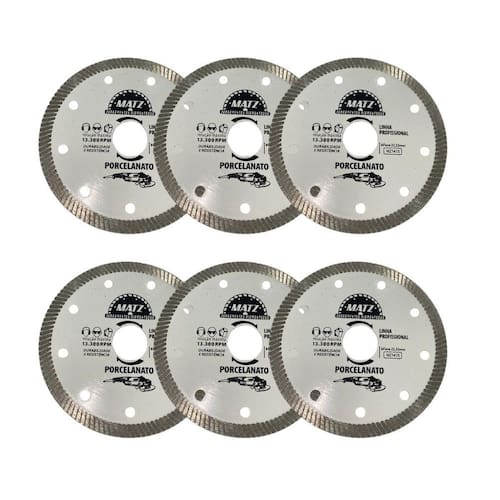 Kit 6 Disco Corte Turbo Para Porcelanato 110Mm X 22,23Mm Matz Disco de corte turbo diamantado para porcelanato, ideal para cortes precisos a seco e refrigerado. Compatível com esmerilhadeira, possui furo adaptável e acompanha anel de redução para uso em serra mármore Makita . Seu design turbo garante cortes rápidos e sem lascas, oferecendo alta durabilidade e acabamento impecável. Perfeito para aplicações em porcelanato, combinando praticidade e desempenho profissional em diferentes ferramentas.