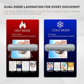 - Modos duplos para resultados perfeitos: se você está trabalhando com documentos padrão ou materiais delicados e sensíveis ao calor, este laminador tem o que você precisa. Use o modo quente para papéis, fotos e certificados comuns (compatível com as bolsas de laminação térmica incluídas no kit). Para o modo frio, emparelhe-o com folhas de laminação autoadesivas (não incluídas) para proteger adesivos, fotografias antigas ou itens frágeis sem qualquer calor.