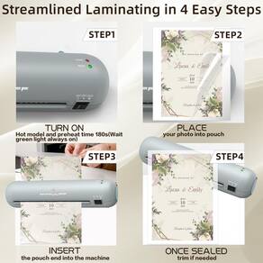 - 3 minutos de aquecimento para economizar seu tempo: sabemos que seu tempo é precioso, seja você um professor ocupado preparando materiais de sala de aula ou um pai laminando fotos de família queridas. É por isso que este laminador se aquece em apenas 3 minutos! Sem esperas longas nem momentos perdidos: realize suas tarefas com mais rapidez para que você possa se concentrar no que realmente importa.
