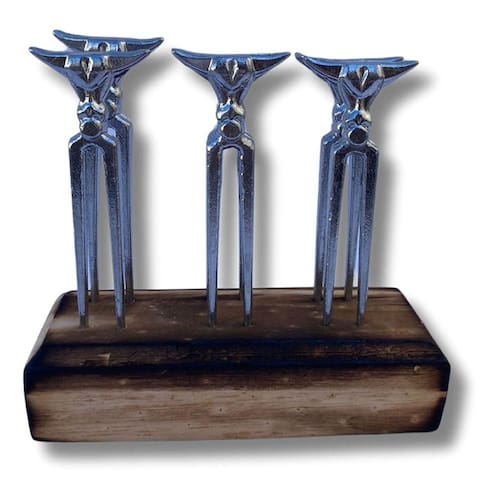 Kit com suporte de madeira e garfos de petiscos, ideal para sua churrasqueada, porções de carnes, legumes, tabuas de frios e fondue.
