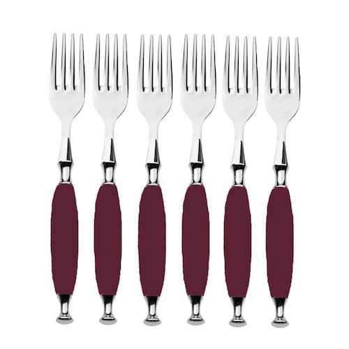 O conjunto de 6 garfos para sobremesa da Linha Country da Bugatti apresenta cabo em acrílico com efeito madrepérola suavemente arredondado e aro cônico em aço polido.