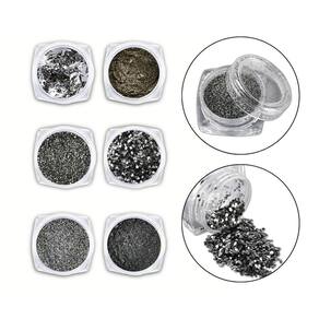 Características Principais: - 6 potinhos individuais; - Variados tons de prata; - Combinação de glitters finos, flocados e pó cromado; - Texturas variadas e efeitos brilhantes; - Tampa rosqueável que evita desperdício e facilita o armazenamento; - Ideal para quem busca adicionar mais glamour e criatividade aos seus designs.