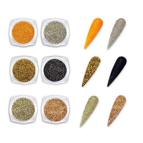 6 - Unidades de Glitter Fino Preto, Prata e tons de Dourado.