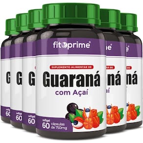 Kit 6 potes de guaraná com açaí 750mg com 60 cápsulas fitoprimeIngredientes:Guaraná em pó, açaí desidratado em pó, óleo de soja e emulsificante lecitina de soja. Composição da cápsula: gelatina, água purificada, umectante glicerina e corantes vermelho azorrubina, vermelho 40 e azul patente v. Não contém glúten. Alérgicos: contém derivados de soja.Apresentação:Frasco com 60 cápsulas de 750mg.Sugestão de uso:Ingerir 4 cápsulas ao dia.Conservação:Após aberto, manter a embalagem bem fechada e armazenar em local fresco, seco e ao abrigo de luz.Produto lacrado para sua proteção. Não utilizar em caso de violação. Manter fora do alcance de crianças. produto dispensado de registro conforme rdc 240/2018.
