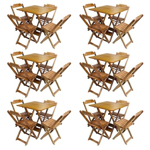 Kit 6 Jogos De Mesa Com 4 Cadeiras De Madeira Dobravel 60x60 Ideal Para Bar E Restaurante - MelÉ ideal para bares, restaurantes, estabelecimentos, áreas de lazer e tambem para sua casa. Feito em madeira maciça, tornando resistentes e duráveis. Seu design permite que seja encaixado em qualquer ambiente, trazendo um toque a mais para seu estabelecimento. Além de sua durabilidade, o que lhe trará conforto para servir seus clientes. Por ser dobrável torna-se mais fácil guardar, manusear e limpar o produto.Atenção: EVITE USAR PRODUTOS ABRASIVOS E QUÍMICOS PARA LIMPEZA DO PRODUTO, aconselha-se o uso de pano umedecido para melhor conservação; mantenha o produto fora de chuva e sol constantesMESACor: MelModelo: DobravelDimensões: Altura 76cm | Largura 60cm | Profundidade 60cmCADEIRACor: MelModelo: DobravelDimensões: Altura 80cm | Largura 45cm | Profundidade 42cmKit 6 Jogos de Mesa com 4 Cadeiras de Madeira Dobravel 60x60 Ideal para Bar e Restaurante - Mel Marca: Preguiçosa
