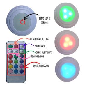 Kit 6 Luminárias Lâmpadas Spots Led Redondas Adesivas A Pilhas RGB Coloridas Sem Fio Com Controle Remoto Para Paredes Kit 6 Luminárias Lâmpadas Led Spot Sem Fio Com Controle Remoto, ideal para serem utilizadas em guarda-roupas, armários, gavetas, corredores, varandas, escritórios, quartos, estantes, cabeceiras de camas, toaletes, espelhos, nichos, closets, escadas, balcões, escrivaninhas e em vários locais que necessitam de iluminação colorida sem a necessidade de perfurações, parafusos e cabos. Especificações do produto:- Material: ABS- Formato da luminária: Redonda- Quantidade de led: 3 leds por luminária- Tensão: 4,5V Cada Spot - Fonte de Energia: 3 Três Pilhas AAA para cada spot Pilhas não inclusas - Cor do Produto: Branco- Cor da Luz: RGB Colorida - Potência: 1,2W / 50 LM Cada Spot - Medidas de cada spot: 7 x 3 cm- Medidas do Controle Remoto: 3,9 x 8,5 x 0,6 cm- Modelo da bateria do controle remoto: CR2025- Distância do controle remoto: Até 5 metros- Peso total de cada kit 3 luminárias: Aproximadamente 130 gramas Atenção: Esse produto não é a prova de água, e também, não deverá ser instalado em lugar úmido, caso contrário, o produto será danificado. Manual Rápido- Coloque 3 pilhas AAA em cada luminária - Solte o lacre Fita transparente do controle remoto para sua operação- Solte e cole um dos lados do adesivo dupla face e fixe na luminária, por fim solte a outra parte do adesivo e fixe no lugar desejado. Observe se o lugar está limpo e adequado para a fixação.- As cores poderão ser operadas de duas maneiras: Uma apertando no centro da luminária ou pelo controle remotoFunções do controle remoto: ON Liga OFF Desliga Multi Color Fica trocando de cores automaticamente TIMER Controla as horas que ficará ligada diretamente MODE Muda a intensidade da cor branca para fraca e forte - Quando o controle não tiver mais funcionando a bateria deverá ser substituída Itens inclusos:- 6 Luminárias spot RGB- 2 Controles remotos- Kit 6 adesivos para fixações das luminárias