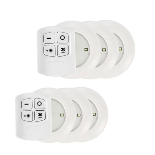 Kit 6 Luminaria Lampada Led Spot Sem Fio Controle Remoto Pilha Adesivo O controle remoto IR permite que você ajuste o brilho em 2 níveis, e também, permite o controle de tempo para desligar a luz em 30 minutos sem fio. Você também pode ligar / desligar a luz do disco, tocando no na lente das luzes. Cada luminária possui 5 leds. Instalação Fácil: Use o adesivo de dupla face para fixar em qualquer lugar que você queira iluminar. Alimentado por pilhas AAA não incluídas para instalação sem fio. Ideal para cozinha, armário, Rack, mesinha de cabeceira, balcão, prateleira, garagem, porão , Como luz de emergência ou locais escuros semelhantes, onde você pode precisar de alguma iluminação forte por alguns minutos de vez em quando. 5 leds em cada luminária Cor da Luz: Branco Frio Potência: 5w por Luminária Tipo de bateria: 3 pilhas AAA Tipo de bateria de controle remoto: 2 pilhas AAA Tipos de acendimento: toque ou controle remoto Dimensão lâmpada: 9x7x2.1cm Dimensão controle: 8x5.9x1.5cm Conteúdo da embalagem 6 Luminárias Com 5 Leds Cada 2 Controles Remotos Imagens meramente ilustrativas