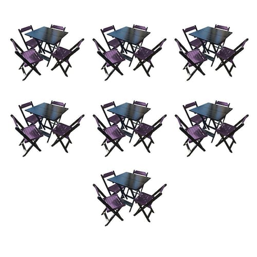 Kit 7 Mesas De Madeira Dobrável Preto 70x70 Com 4 Cadeiras Dobráveis Roxo É ideal para bares, restaurantes, estabelecimentos, áreas de lazer e também para sua casa. Feito em madeira maciça, seu design permite que seja encaixado em qualquer ambiente, trazendo um toque a mais para seu estabelecimento. Por ser dobrável torna-se mais fácil de guardar, manusear e limpar o produto.