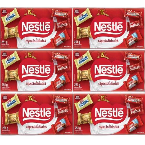 Kit 6 nestle bombons 251gr espec. Cx Os bombons nestlé especialidades são uma caixa de bombons que contém os maiores sucessos da nestlé. A caixa inclui bombons de chocolate branco, chocolate ao leite, recheados com amendoim e morango, entre outros. A caixa de bombons nestlé especialidades contém: -derivados de leite, soja, ovo, cevada e trigo -lactose -glúten -aromatizante sintético A caixa de bombons nestlé especialidades contém: -prestígio, alpino, suflair, classic ao leite, galak, lollo, charge, sensação, chokito, smash, negresco. Contém:251g Cod. Ean 7891000325131 Formato de venda: 01 kit Contém:6 unidade nestle bombons 251gr especialidades Marca: Não Informado