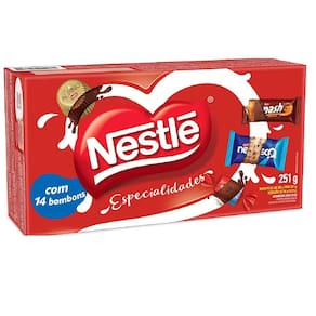 Kit 6 nestle bombons 251gr espec. Cx Os bombons nestlé especialidades são uma caixa de bombons que contém os maiores sucessos da nestlé. A caixa inclui bombons de chocolate branco, chocolate ao leite, recheados com amendoim e morango, entre outros. A caixa de bombons nestlé especialidades contém: -derivados de leite, soja, ovo, cevada e trigo -lactose -glúten -aromatizante sintético A caixa de bombons nestlé especialidades contém: -prestígio, alpino, suflair, classic ao leite, galak, lollo, charge, sensação, chokito, smash, negresco. Contém:251g Cod. Ean 7891000325131 Formato de venda: 01 kit Contém:6 unidade nestle bombons 251gr especialidades