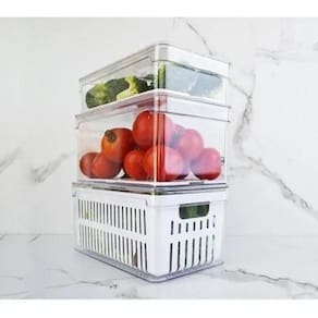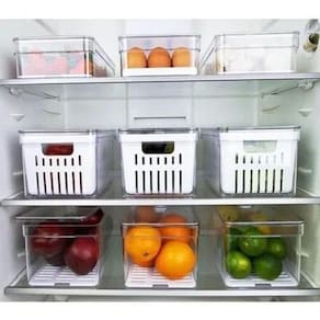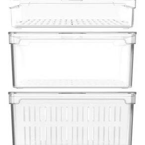 Kit 6 Organizadores De Geladeira Fresh Transparentes Clear Cor: Transparente F6112 Kit 6 Organizadores De Geladeira Transparentes Caixas Armazenadoras De Frutas Legumes Clear Fresh OU. Organizadores De Geladeira De Drenagem Com Respiradouro Caixa de Armazenamento de Frutas Legumes E Vegetais Conjunto Linha Clear Fresh OU Dimensões Do Organizador Com Escorredor: 30cm (C) x 15cm (L) x 13cm (A) Dimensões Área De Uso: 28m (C) x 14cm (L) x 12,5cm (A) Dimensões Do Escorredor: 27cm (C) x 13,5cm (L) x 11,5cm (A) Dimensões Do Organizador Com Bandeja: 30cm (C) x 15cm (L) x 13cm (A) Dimensões Área De Uso: 28m (C) x 14cm (L) x 12,5cm (A) Dimensões de organizador de ovos 30m (C) x 15cm (L) x 7cm (A) Limpeza e Cuidados: - Lavar com água e sabão neutro utilizando esponja macia, seguido de pano seco; - Não utilizar produtos químicos ou abrasivos na limpeza. Evitar batidas. Detalhes do Produto: - Possuem bandejas e cesto de drenagem que evitam que os alimentos fiquem molhados e os mantem longe das paredes externas, permitindo o fluxo de ar; - Possuem respiradouros reguláveis que permitem ventilação e elimina os gases produzidos pelos alimentos, evitando decomposição precoce; - Não suportam máquina de lavar; - Não suportam micro-ondas; - Livres de Bisphenol A; - Não suportam freezer; - Suportam geladeira; - Empilháveis. Material: - Polipropileno: Alta resistência a impactos e ao calor. Não transfere odor, nem gosto aos alimentos. Atóxico, pode entrar em contato com alimentos. Resistência à água fervente, suportando até 150 C; - Poliestireno: Translúcido com baixa resistência a impactos. Ótima transparência e alto brilho. Não transfere odor, nem gosto aos alimentos. Atóxico, pode entrar em contato com alimentos. O Conjunto de 4 Caixas de Armazenamento Para Frutas e Vegetais Empilháveis e porta ovos da linha Clear Fresh ajuda não só a aproveitar melhor o espaço da geladeira, mas também a manter os alimentos refrigerados, garantindo refeições frescas e o bem estar de sua família. Ideais para conservar frutas, legumes e vegetais, os organizadores de geladeira possuem sistema de ventilação e umidade controlada pelos respiradouros e por suas bandejas e cesto de drenagem que evitam o ressecamento e deterioração precoce dos alimentos. Produzidas em plástico transparente, livres de BPA as caixas porta frutas e legumes permitem que você visualize o conteúdo armazenado com facilidade. Empilhe, encaixe e crie diversas composições.