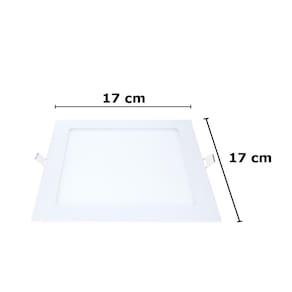 Informações técnicas: LED integrado Potência: 12W Temperatura: 3000K Emissão de luz amarela Medida: 17x17 cm Forma: Quadrado Lúmens: 720 IRC: =70 Ângulo de abertura: 120 Material: Corpo em alumínio, difusor em vidro, corpo do driver em plástico Eficiência luminosa: 60lm/W Painel de embutir Vida útil: 25 mil horas L70 Pode ser ligado diretamente na rede elétrica em 127V ou 220V Espessura do forro deve ser pelo menos 1cm Não permite dimerização