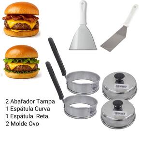 Kit 6 Peças Lanchonete Hamburgueria Chapa Lanche Hambúrguer Artesanal Espátulas Modelador Prepare Lanches e Hambúrgueres Perfeitos em Casa com Praticidade Eleve o nível dos seus lanches caseiros com este kit essencial Ideal para quem ama hambúrgueres suculentos, ovos no ponto certo e a praticidade de ter as ferramentas certas sempre à mão. Surpreenda sua família e amigos com preparos dignos de lanchonete, feitos no conforto da sua cozinha. O que você recebe neste Kit Completo: 2 Abafador de Hambúrguer em Alumínio 2 Molde para Fritar Ovos em Alumínio 1 Espátula Reta em Aço Inox 1 Espátula Curva em Aço Inox - Não enferruja; - Alta durabilidade; - Fácil de limpar; - Não amassa; - Mais praticidade Espátulas de Aço Inox projetadas perfeitamente para manusear o alimento sem danificar, com muita facilidade e perfeição em uma chapa, frigideira ou fritadeira Modelador de Hambúrguer também feito em liga de alumínio robusto. Muito fácil de usar, basta escolher a quantidade de carne que você deseja em seu hambúrguer pequeno ou grande e pressionar na parte de cima do modelador. Seu hambúrguer artesanal caseiro ficará com o molde perfeito, idêntico aos que você encontra nos restaurantes americanos, só que muito mais gostoso e saudável Abafadores de alumínio reforçado garantem que os ingredientes não fiquem secos nem crus, facilitam o derretimento do queijo no preparo de mistos ou x-burgers, o que torna tudo mais gostoso Aro Modelador de alumínio para fritar ovos perfeitos, deixando eles com o tamanho e formato ideal para seus lanches Todos os metais utilizados são antibacterianos e cabos plásticos para maior conforto na hora do preparo de seus lanches, indispensáveis para o trabalho na cozinha, seja você um iniciante no uso doméstico ou um chapeiro em seu comércio. O acabamento das peças é lindo e elegante, de aparência robusta e detalhada. Muito práticos de usar, cada um com seus designs funcionais que se complementam, ressaltando que o ideal é manter a atenção e cuidado pois as lâminas levemente cortantes podem causar acidentes com crianças. Desfrute dos melhores momentos com sua família e amigos, seja no churrasco ou aquele lanche rápido durante a semana, não abra mão da qualidade e de alimentos bem preparados, suculentos e saborosos de um jeito prático. Não perca essa oportunidade de impressionar seus convidados e comer o melhor lanche da sua vida sem sair de casa CARACTERISTICAS DOS ITENS: -espátula Chapeiro em Inox Reta para Lanches 120mm Western Tamanho Aproximado: 24,5cm de Comprimento x 12cm de Largura Espátula Curva para Chapeiro Inox 60mm Western EC-60 - Dimensões da Peça: 26 x 6 x 4cm - Dimensões da Embalagem: 32,5 x 8,5 x 4,5cm - Material: Aço inoxidável ,PP - Cor do cabo: Branco - Tipo de Embalagem: Suporte - Marca: Western Modelador OVO 10 cm Cabo Baquelite AAL Facil de usar, deixa o Ovo no formato redondo, ótimo para restaurantes e bares. Material: Aluminio Cabo: Baquelite Medida 10 cm Abafador Hamburguer 14 x 4 cm em Alumínio - AAL Abafador para lanches, ótimo para Lanchonetes, Restaurantes e em Casa. Material Alumínio Tamanho 14 x 4 cm