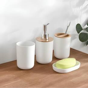 Além de proporcionar organização, a combinação de plástico e bambu confere um design elegante ao seu banheiro. Experimente a praticidade de ter todos os acessórios essenciais em um só conjunto, proporcionando um ambiente de banho mais eficiente e esteticamente agradável. Transforme seu banheiro em um espaço funcional e sofisticado com este kit completo e versátil.