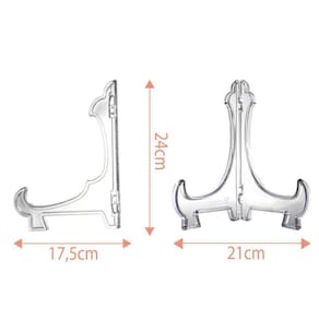 Kit 6 Peças Suporte Para Pratos Acrílico Transparente 24CmDescrição:Suporte de 24cm com travinha de segurança é super leve, dobrável e cabe em qualquer cantinho, ideal para decoração de sala, quarto, home-office ou escritório.Utilize no Rack, estante, painel de TV, mesa de cabeceira, mesas, buffets, prateleiras e aparadores.-ideal para pratos decorativos, quadros, azulejos personalizados, porta-retratos, LP's, e muito mais outros itens;-utilize o suporte para apoiar e exibir aquele Livro ou Revista que estão guardados e que você tanto gosta;-relembre aos momentos, pegue aquele LP que marcou época e utilize na estante para decorar e encantar os familiares;-decoração com discos de vinil está super em alta porque o ambiente fica moderno e descolado;-pode ser utilizado para expor produtos em Vitrine de lojas;Dica: O truque é você aproveitar itens guardados para decorar, contar uma história e relembrar de bons momentos.Utilizar Lp's, Livros, Revistas, Azulejos Decorativos, Quadrinhos e porta-retratos na decoração é super tendência.Caraterísticas:Altura: 24cmComprimento:17,5cmPeso: 118gConteúdo:- 6 x Suporte em Acrílico Transparente