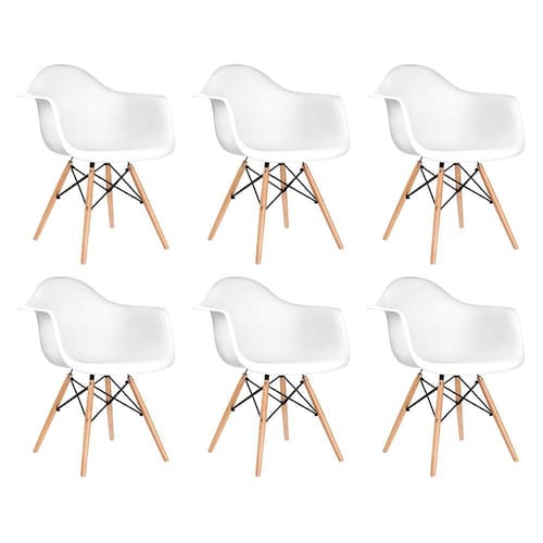 Kit 6 Poltronas Eames De Madeira Com Braço Daw Com Assento BrancoAs Cadeiras Charles Eames Daw - Com Braços ? Design são uma ótima escolha para fazer parte de cômodos como sala de jantar, área de recreação e lazer, entre outros locais. Elas são ideais para quem está em busca de conforto e um design único. Um diferencial importante destas cadeiras é que elas possuem uma base de madeira e o seu assento em polipropileno, sendo materiais que trazem mais resistência à cadeira e um toque de estilo a mais no modelo.- Essa cadeira suporta até 120 quilos.- Garantia de 3 meses contra defeitos de fabricação.- Assento em polipropileno e pés em madeira.LIMPEZAUtilize um pano macio levemente úmido.MEDIDASCor: BrancoAltura ? 79,5 cmLargura - 62 cmProfundidade - 62 cm*As imagens são meramente ilustrativas e podem sofrer variações de cor e pequenos detalhes de acordo com o seu monitor, iluminação do ambiente e até mesmo a sua percepção visual.