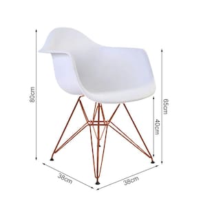 Kit 6 Poltronas Eiffel Eames Branca Com Braço Daw Em Ferro CobreA Poltrona Daw traz ousadia que combina com ambientes de estilo moderno, podendo ser usada em escritórios, cafés, salas de estar ou jantar e outros ambientes. Possuindo braços que a torna uma ótima escolha para quem está em busca de conforto e um design único.Tipo: PoltronaModelo: DawCor do Assento: BrancoCor da Base: CobreCARACTERÍSTICASAssento: PolipropilenoBase: FerroSuporta até: 120kgGarantia: 90 DiasDIMENSÕES DO PRODUTOAltura: 80cmAssento até o chão: 40cmBraço do assento até o chão: 65cmLargura: 38cmComprimento: 38cmRECOMENDAÇÕESLimpeza: Utilize um pano macio levemente úmido.Necessita montagem.ATENÇÃOAS IMAGENS SÃO MERAMENTE ILUSTRATIVAS E PODEM SOFRER VARIAÇÕES DE COR E PEQUENOS DETALHES DE ACORDO COM O SEU MONITOR, ILUMINAÇÃO DO AMBIENTE E ATÉ MESMO A SUA PERCEPÇÃO VISUAL.